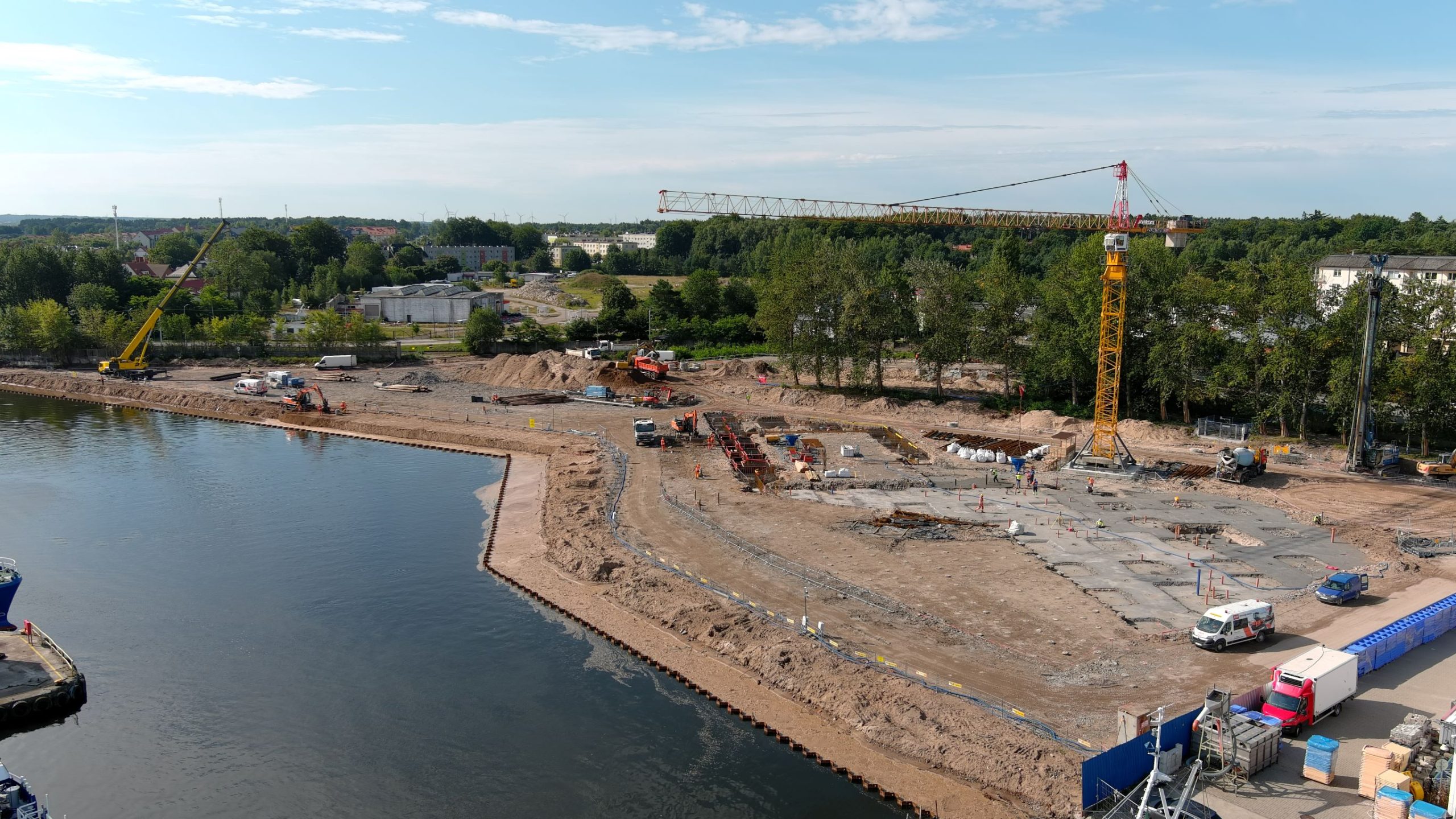 Onshore, the geotechnical work is nearing completion, consisting of soil reinforcement, including the installation of foundation piles. A tower crane has arrived at the construction site to support further work. Foundation work is underway, with base concrete being poured and reinforcement being installed. New steel deliveries are regularly arriving at the project site. The first structural concrete for the new buildings is scheduled to be poured in September – first for the warehouse section, then for the staff and office areas.