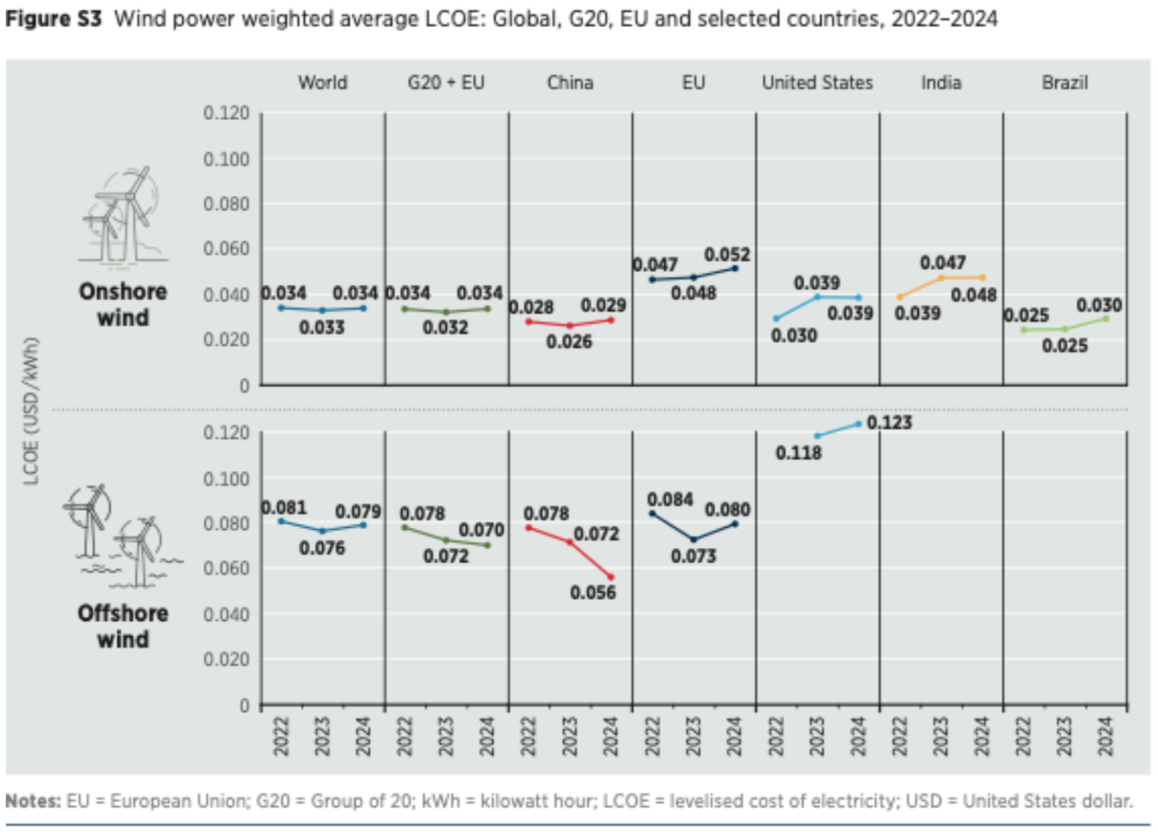 This provides a direct comparison of onshore and offshore wind LCOEs, highlighting regional differences and the competitive edge of certain markets relevant to Europe.
