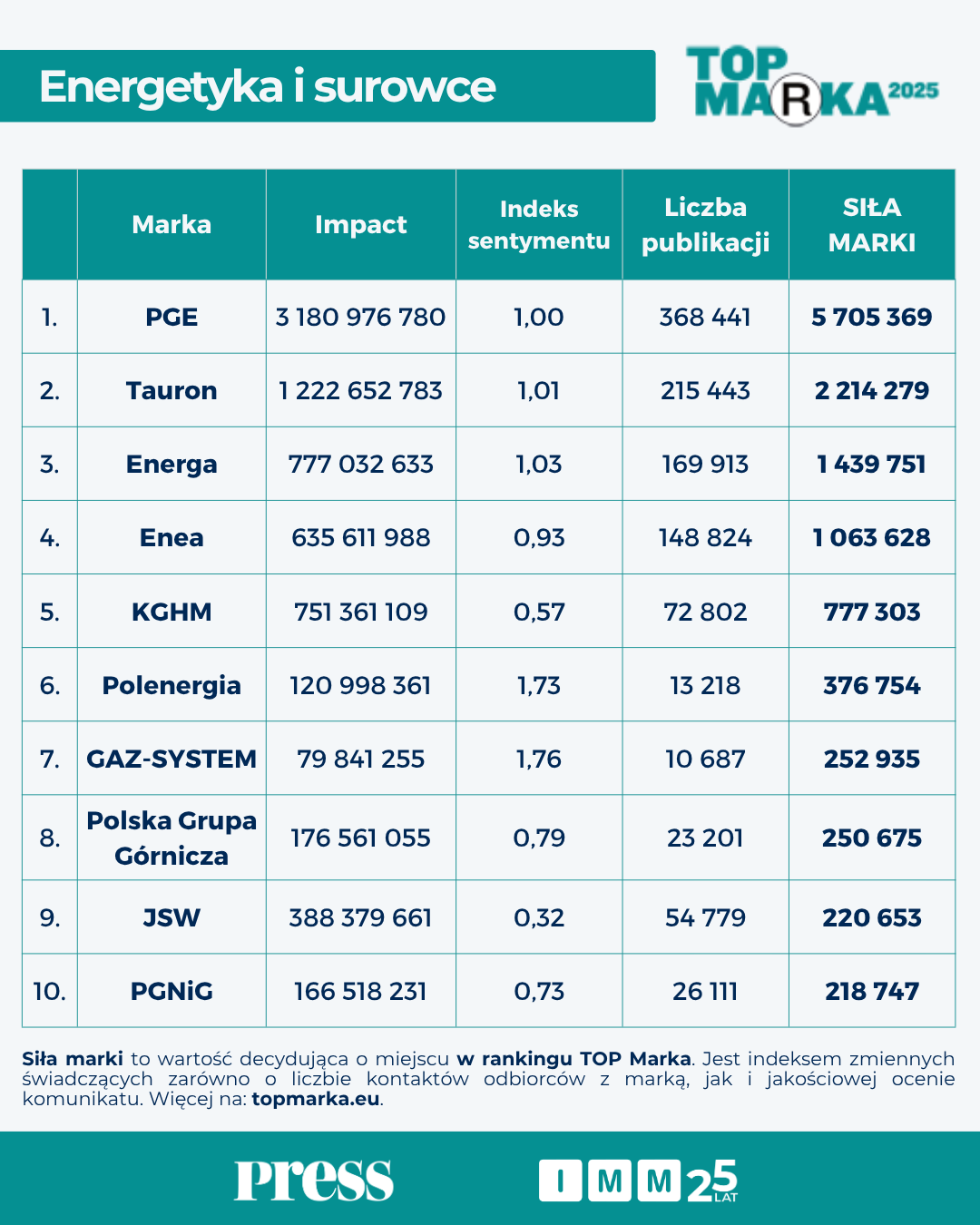 Badanie Top Marka 2025 Magazynu „Press” i Instytutu Monitorowania Mediów obejmuje ponad 17,1 mln wpisów w mediach społecznościowych z Facebooka, Instagrama, X i YouTube’a, 10,1 mln przekazów na portalach internetowych oraz 1,3 mln artykułów prasowych opublikowanych od 1 lipca 2024 do 30 czerwca 2025 roku. Aby wyłonić 500 najsilniejszych medialnie brandów w każdej z 50 branż, zweryfikowano przekazy dotyczące 1020 marek i firm.