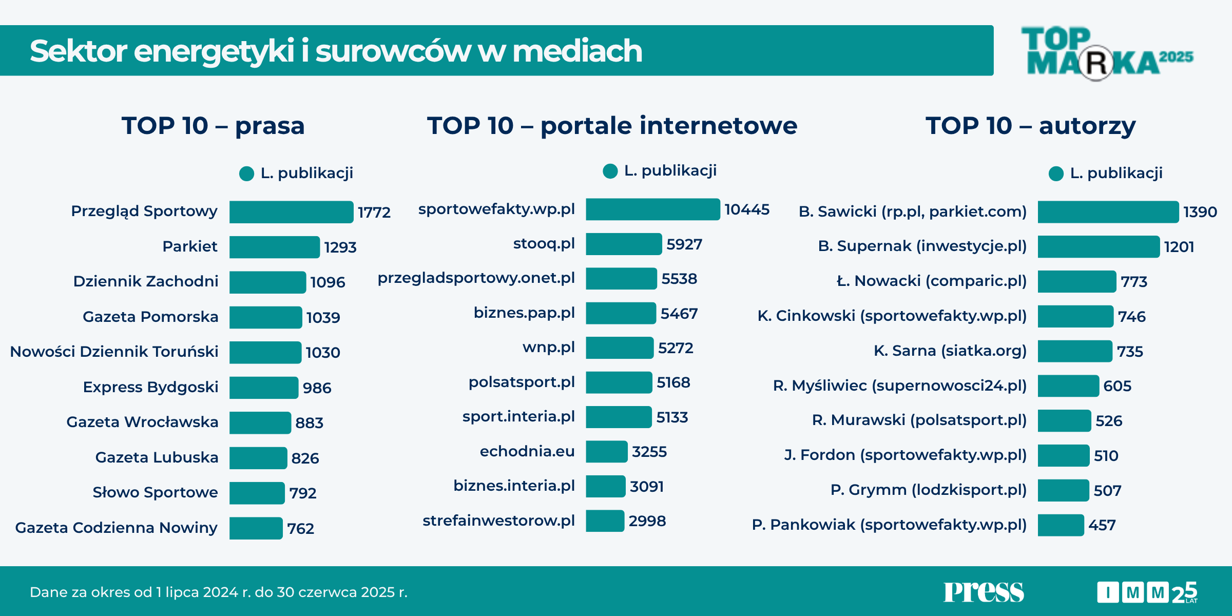 Najwięcej publikacji medialnych w kontekście marek z branży energetyki i surowców odnotowano na portalach internetowych. Wśród serwisów online najaktywniejsze były sportowefakty.wp.pl (ponad 10,4 tys. publikacji), natomiast w prasie dominował „Przegląd Sportowy” (1,8 tys.). Do wysokiej liczby materiałów eksponujących marki przyczyniły się m.in. relacje związane ze sponsoringiem sportowym, w tym z PGE Ekstraligi i 30. edycji Enea Poznań Open. Równocześnie, niezwykle istotne były serwisy ekonomiczne (stooq.pl i biznes.pap.pl). W badanym okresie najwięcej informacji o branży energetycznej napisali Bartłomiej Sawicki (rp.pl, parkiet.com) i Bartłomiej Supernak (inwestycje.pl).
