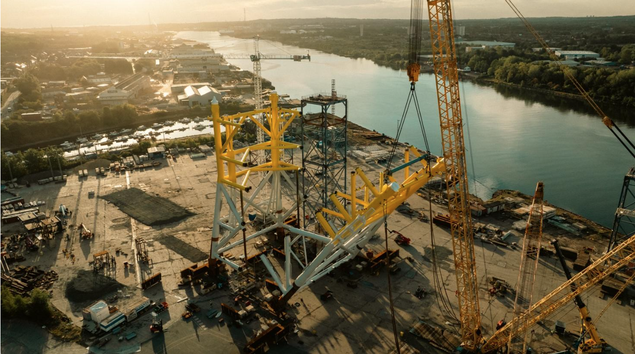 The preliminary production of the main part (the topside) of one of the two offshore power stations has also been completed and prepared for further equipping. Its weight exceeds 3,500 tonnes. At the same time, the production and assembly of the jacket support structure on which the platform will be mounted has been completed. The structure itself weighs almost 3,500 tonnes and has impressive dimensions: over 40 metres in length and width and over 50 metres in height.